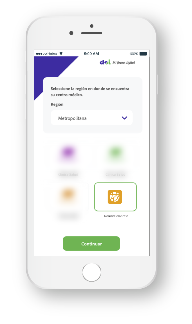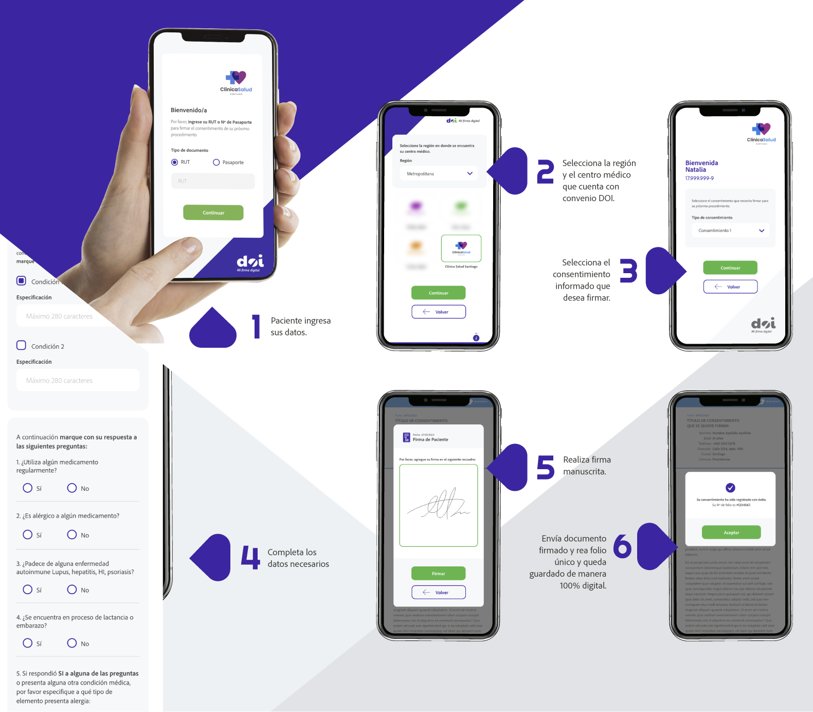 En la aplicación el paciente ingresa sus datos, selecciona el centro médico que cuenta con convenio DOI. Luego selecciona el consentimiento informado que desea firmar, completa los datos y realiza la firma en manuscrito. Finalmente, envía el documento firmado, se crea un folio único y queda guardado de manera 100% digital.